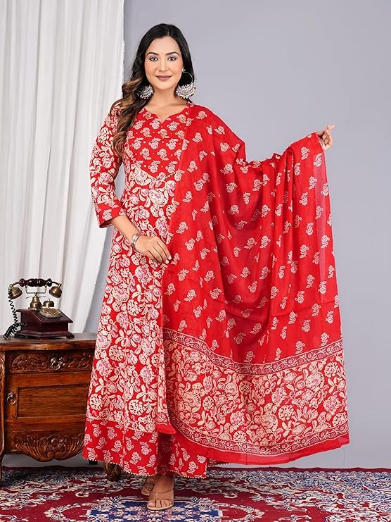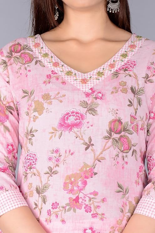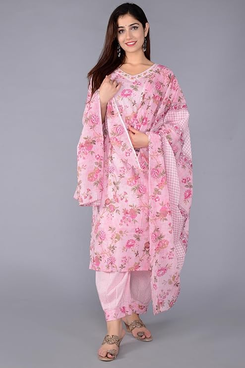 - Kurta Fabric:- Cotton || Style:- Straight Kurta || Length:- Calf Length || Sleeves Type :- 3/4 Sleeves || Neck Style:- Round and V-Neck || Work : Printed & Embroidered Work on Front ||This set include s:- Womens Straight Kurta with Pant and Dupatta Set